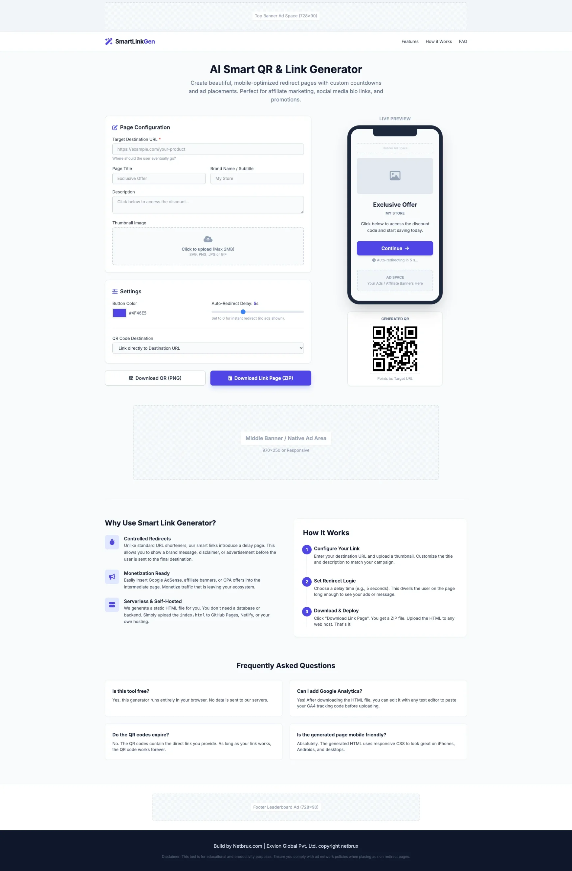 Create powerful, mobile-optimized redirect pages with countdowns, branded messaging, and built-in ad placement using the AI Smart QR & Link Generator. Perfect for affiliate marketers, social media creators, e-commerce sellers, influencers, and anyone who needs smarter links with higher conversions.