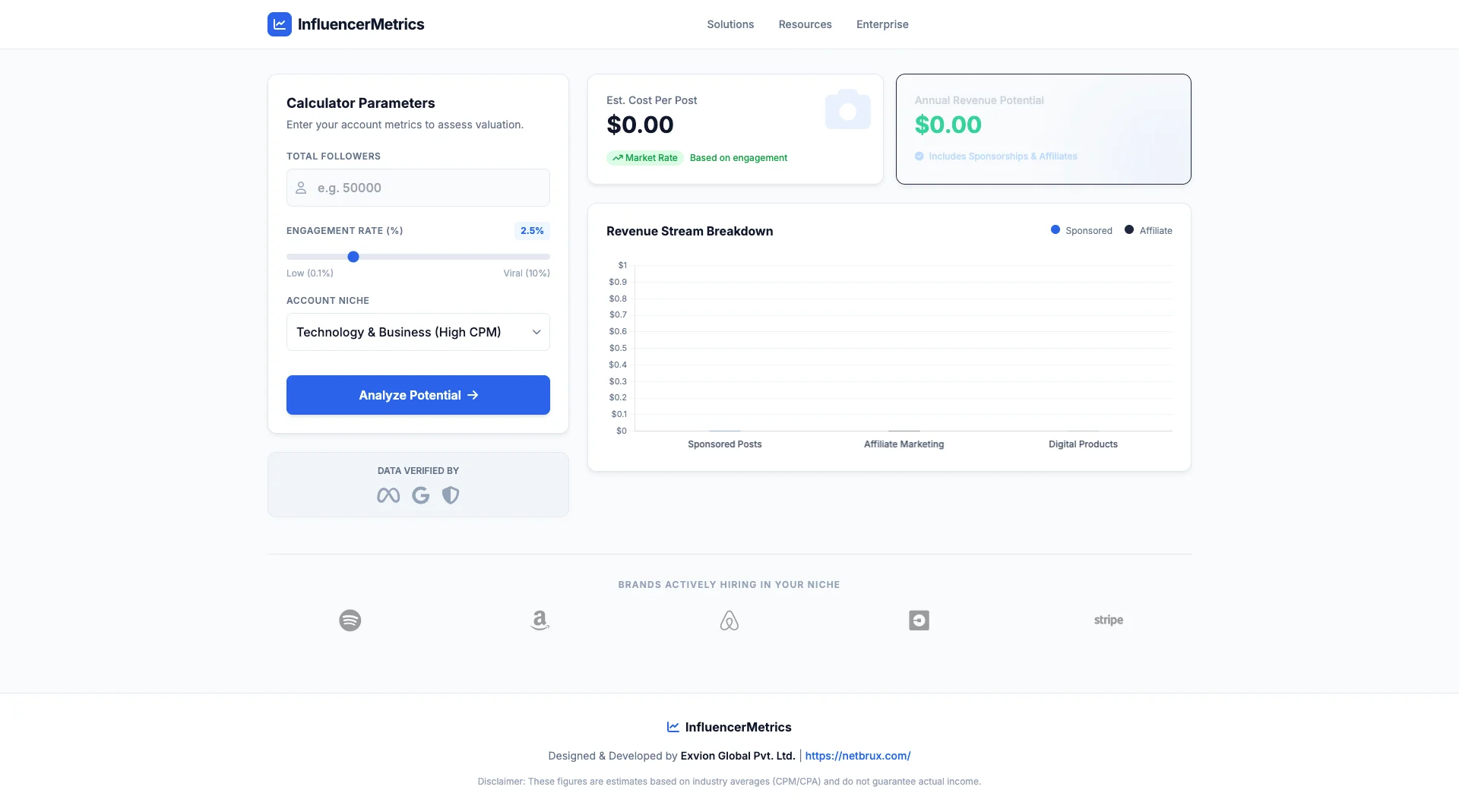 A powerful valuation tool that helps influencers, creators, and social-media managers calculate fair pricing, revenue potential, and earning opportunities based on real engagement data.