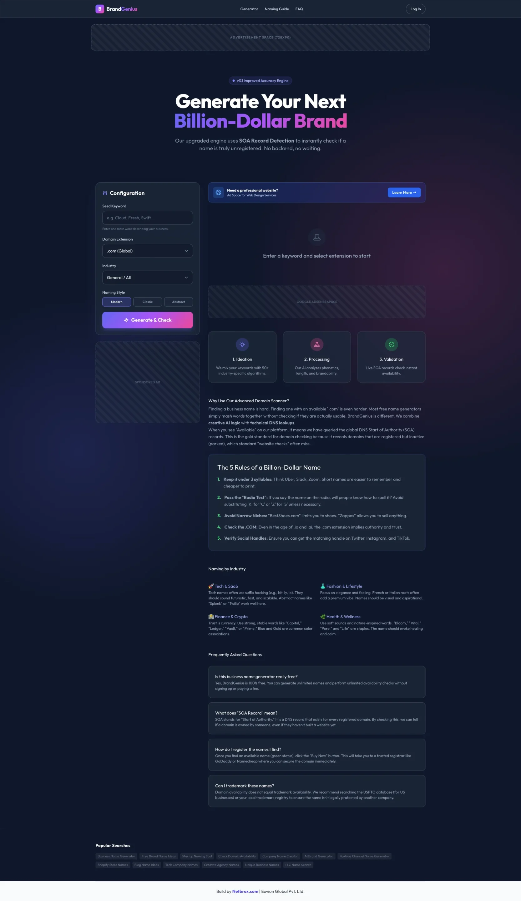 Create unforgettable, billion-dollar-ready brand names in seconds with this Premium AI Brand Name Generator. Powered by an upgraded SOA Record Detection engine, it instantly checks real domain availability—no backend, no delays, no guesswork.