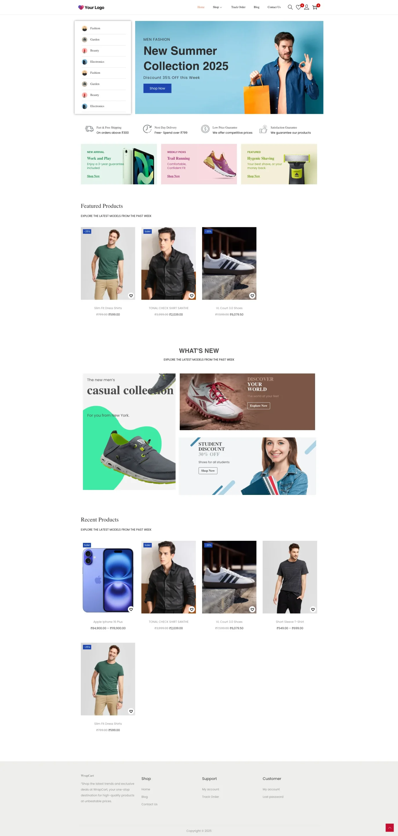 PayPal, Stripe, Razorpay, COD integration. Zone-based shipping, flat rate, free shipping. Coupon & discount system built-in