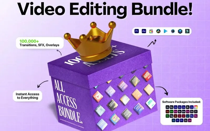 Get over 70 GB of video editing assets, including transitions, overlays, fonts, LUTs, FX, premade templates, and premium software like Premiere Pro, After Effects, and six additional Adobe products. On top of that, get a full-fledged video editing course to get you started.